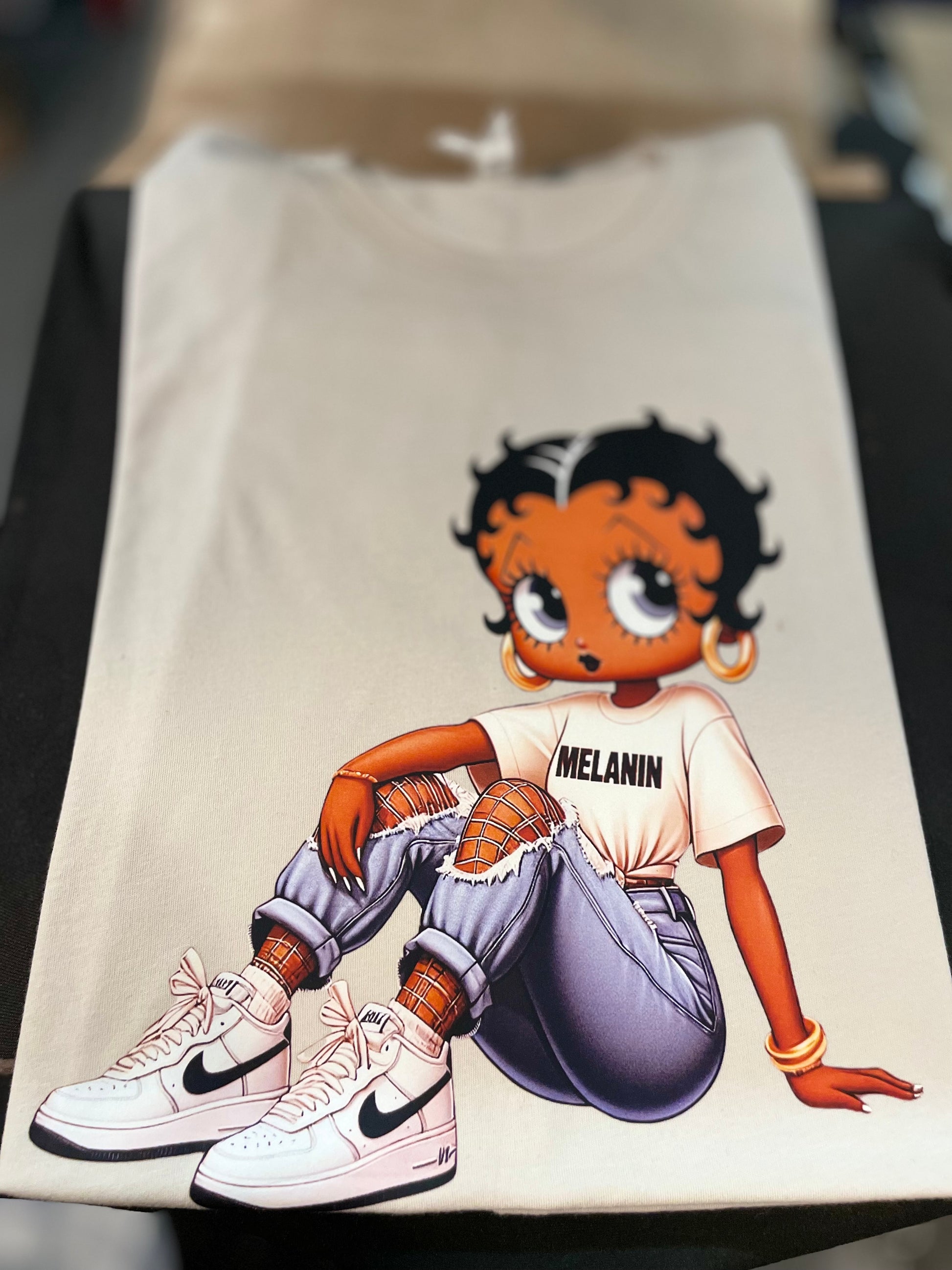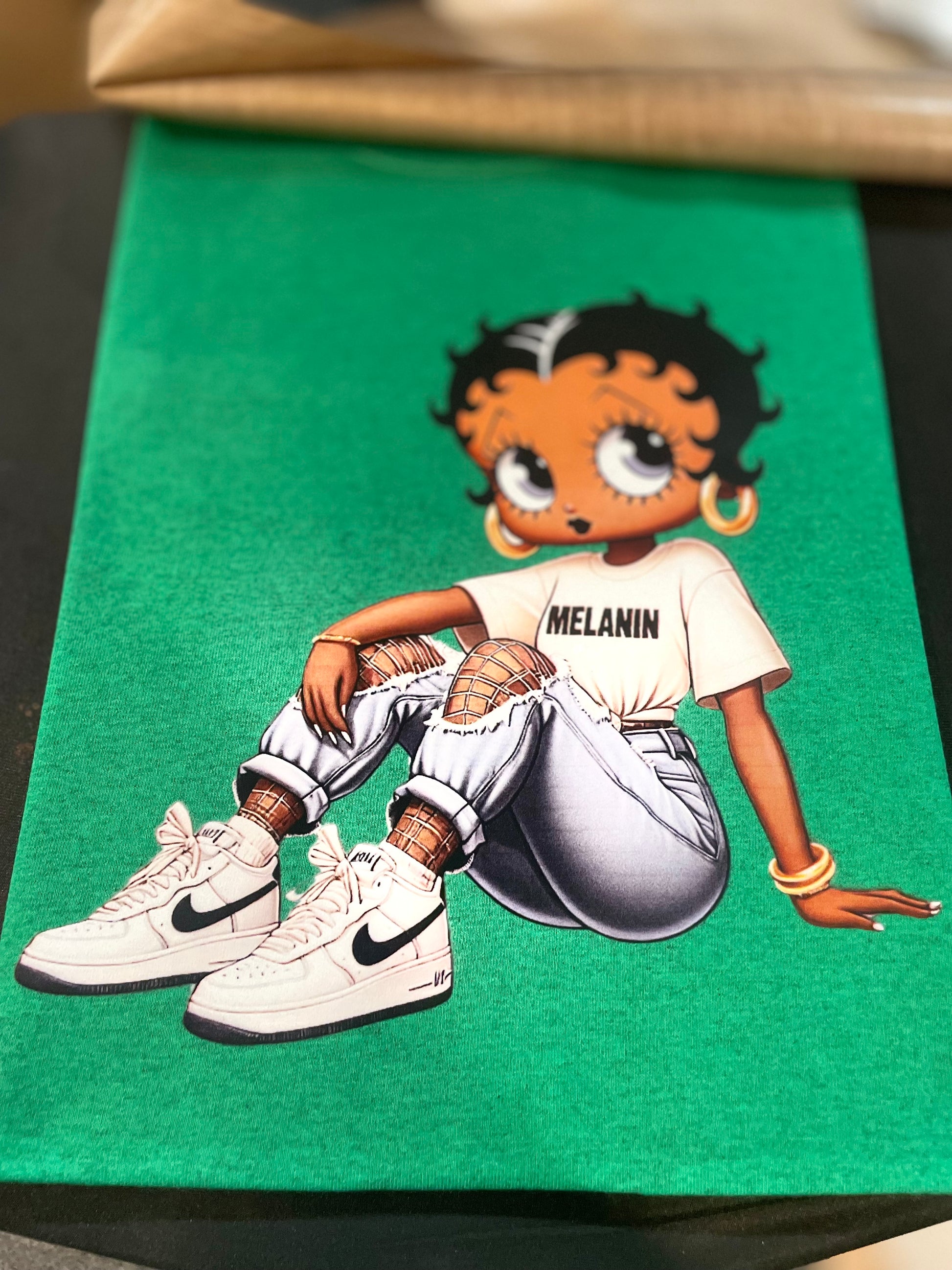 The MELANIN BETTY BOOP t-shirt is expertly crafted using high-quality materials, promising a lavish and comfortable fit. Our t-shirts are made with either Bella Canvas and Gildan, with a processing time of 3-5 business days. Please note that custom orders are non-refundable.