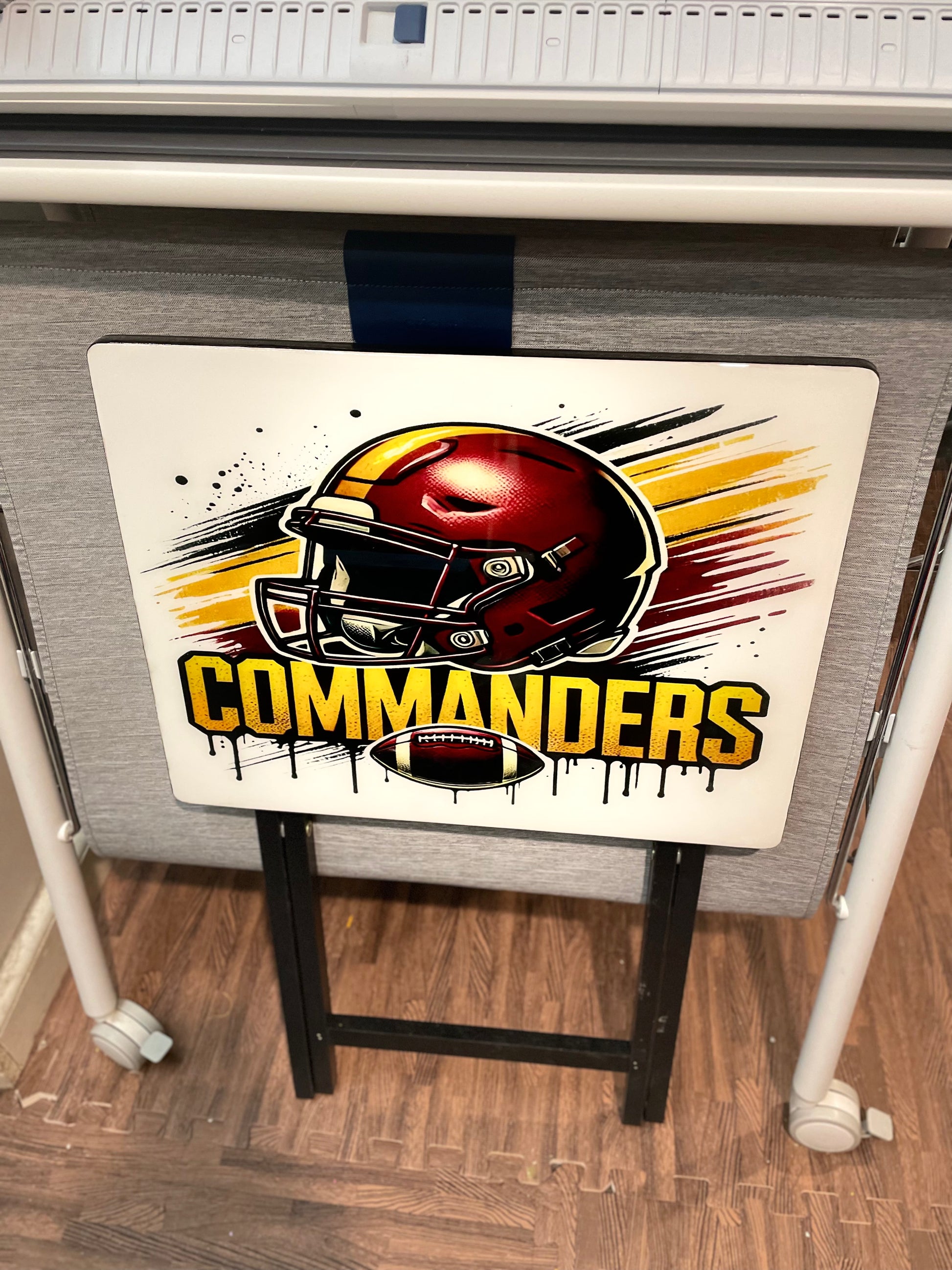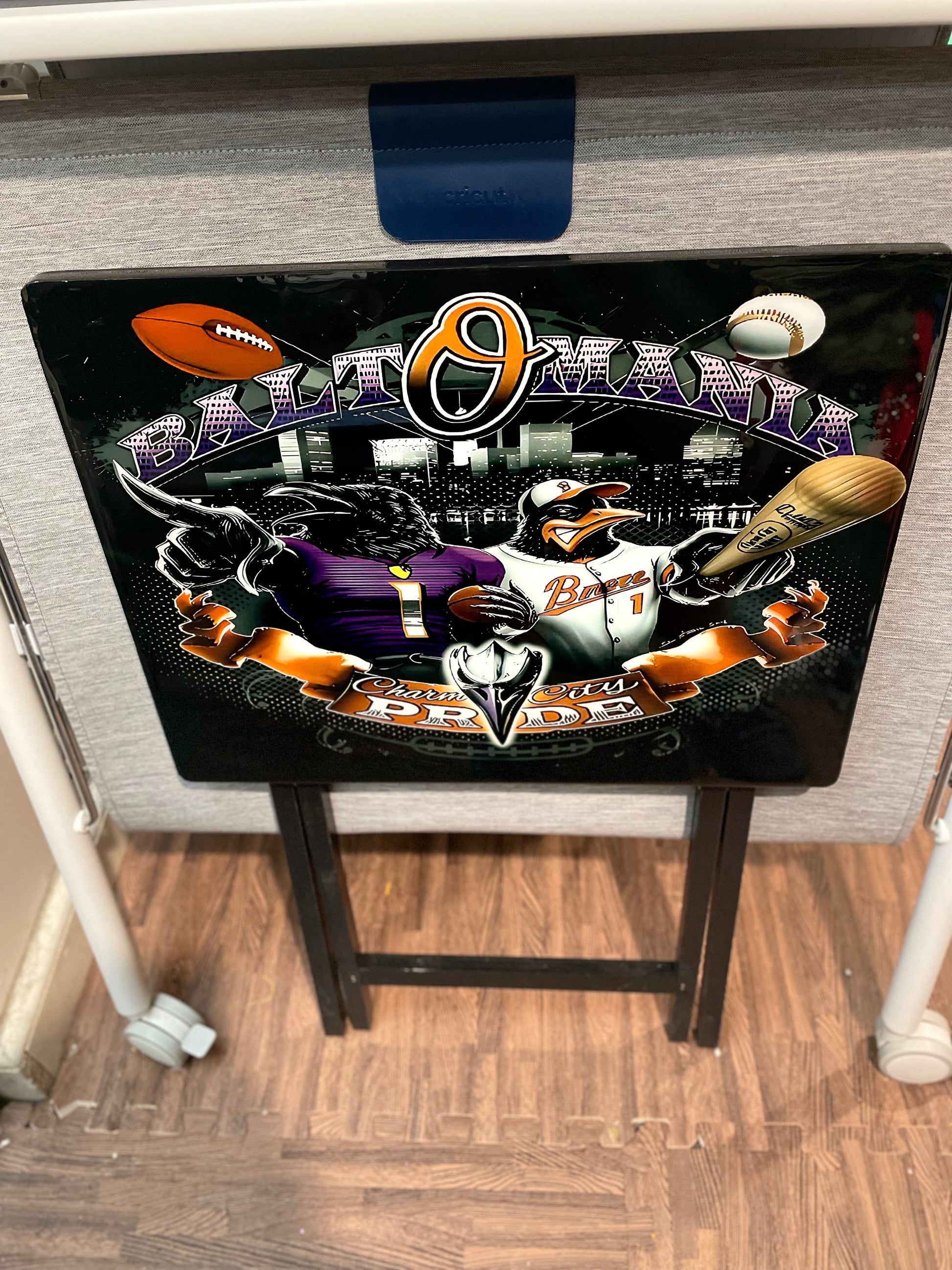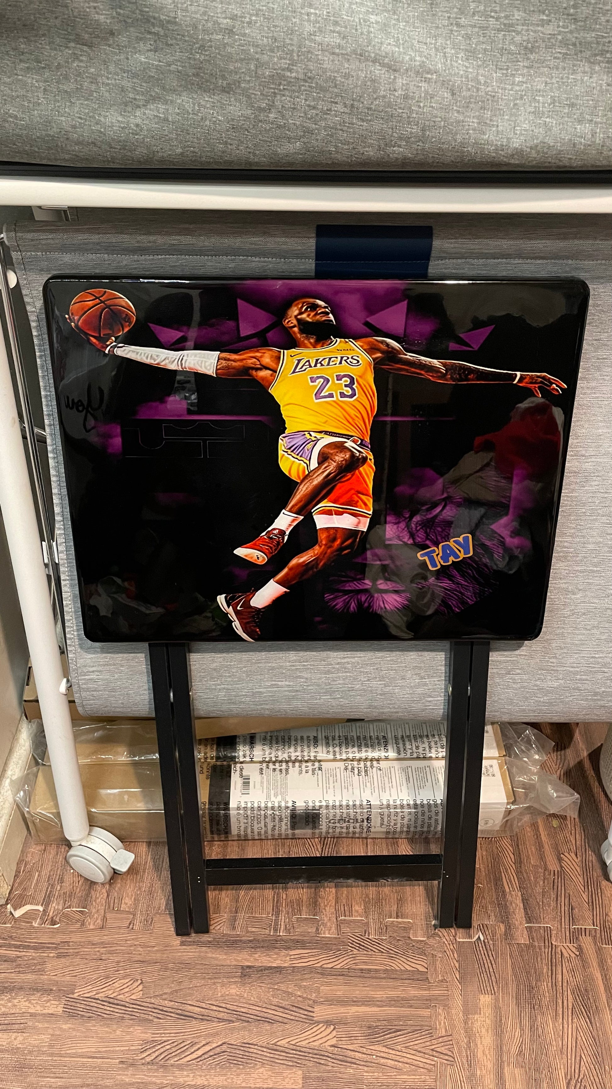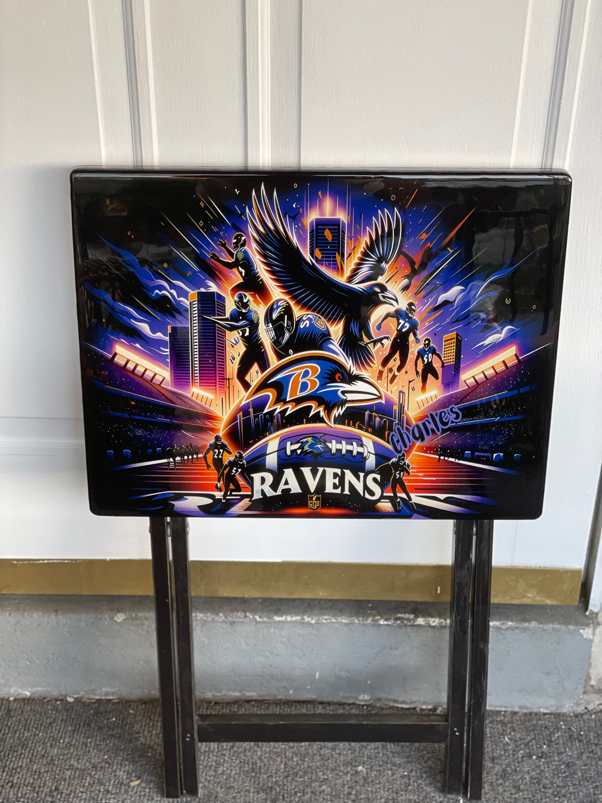 Looking for a bold and practical addition to your home? Look no further than our one-of-a-kind TV trays! These foldable trays are the ultimate solution for maximizing your personal space and can be utilized for work, dining, and multitasking. Simply upload your desired image and add a personal touch with a name to truly make it your own. Each tray, measuring 19 x 15 x 26, is protected with epoxy and will be processed within 5 business days. Keep in mind, all customized orders are final and non-refundable. Get yours now and take on new challenges with confidence!
