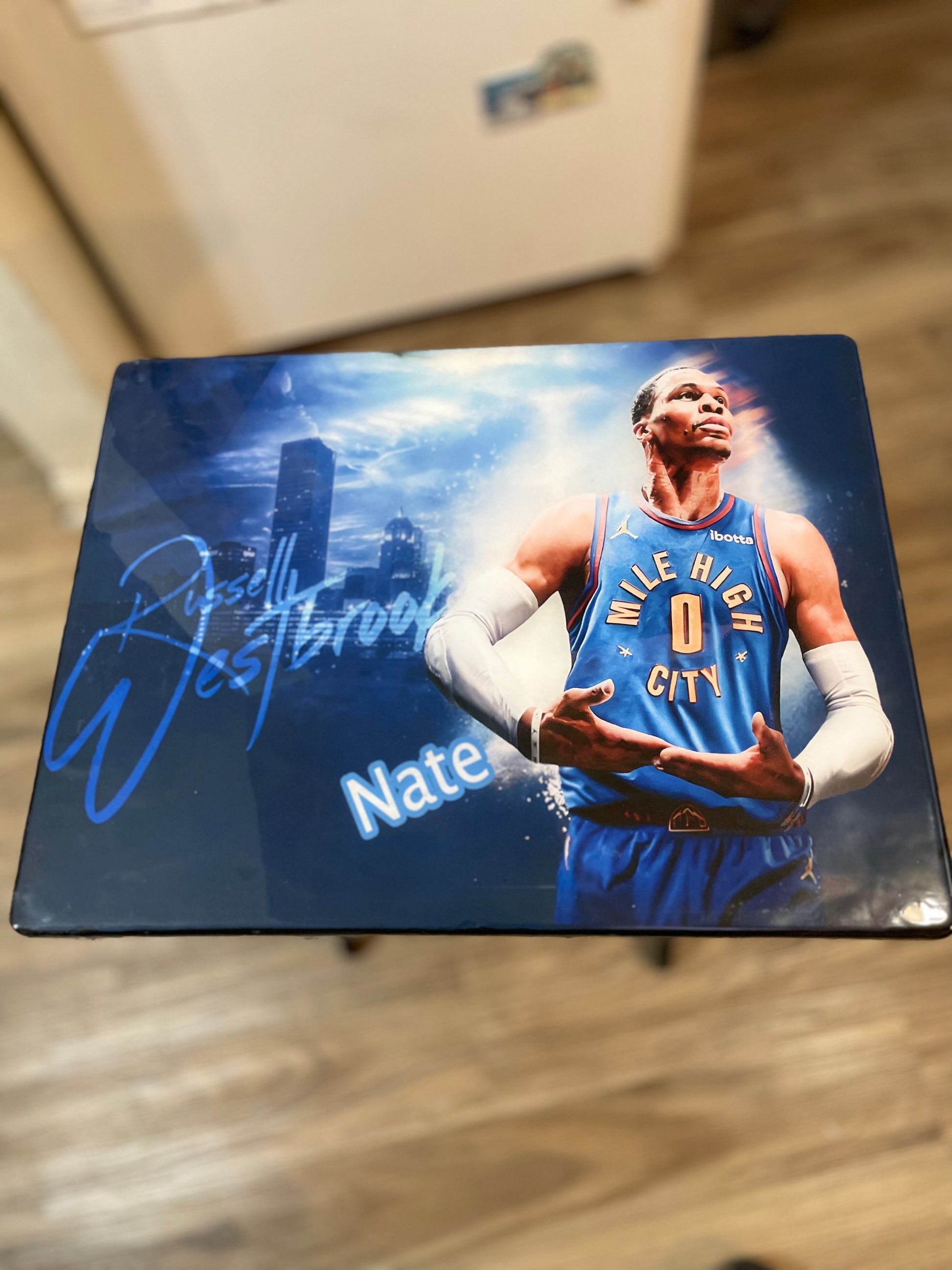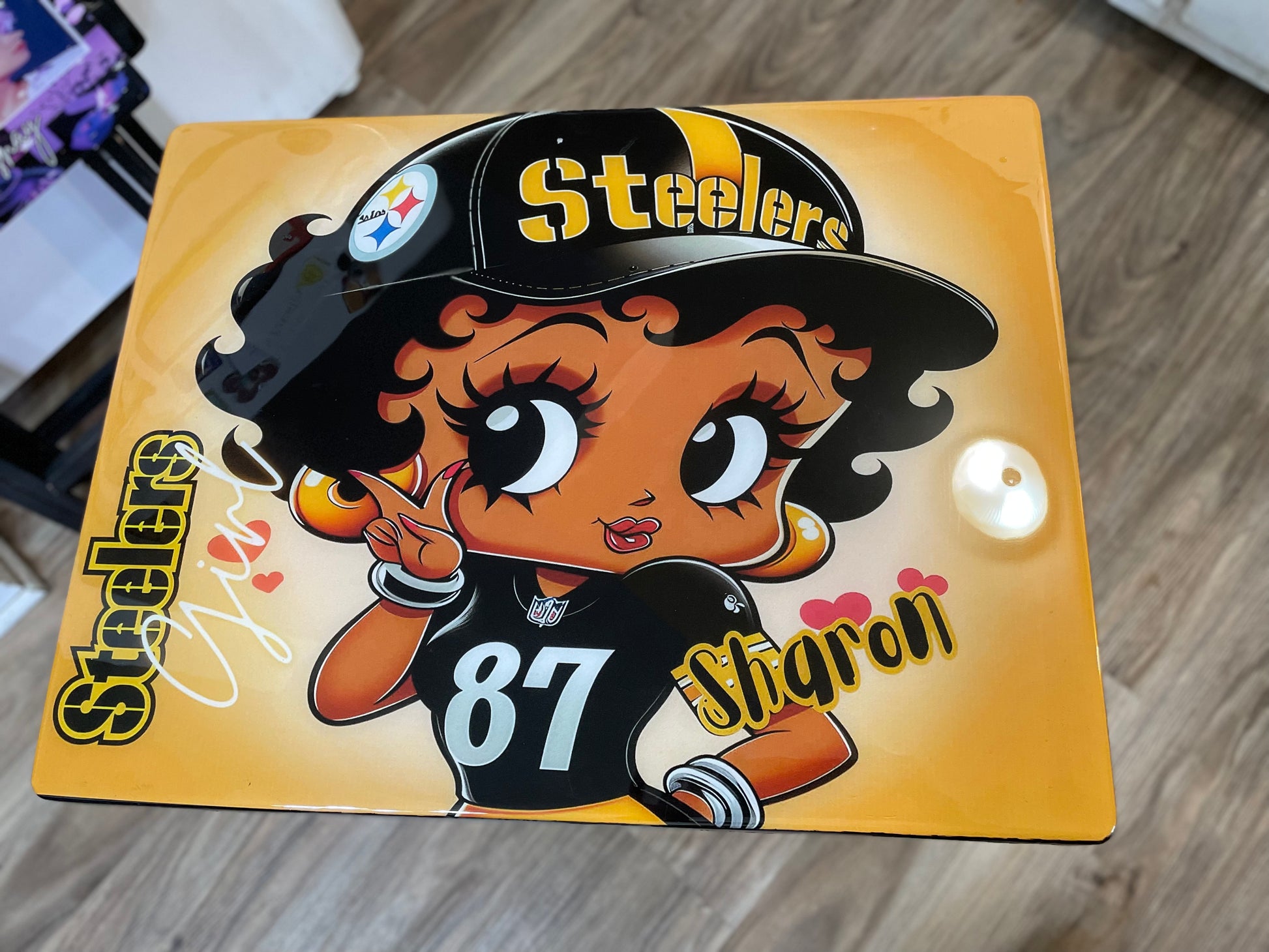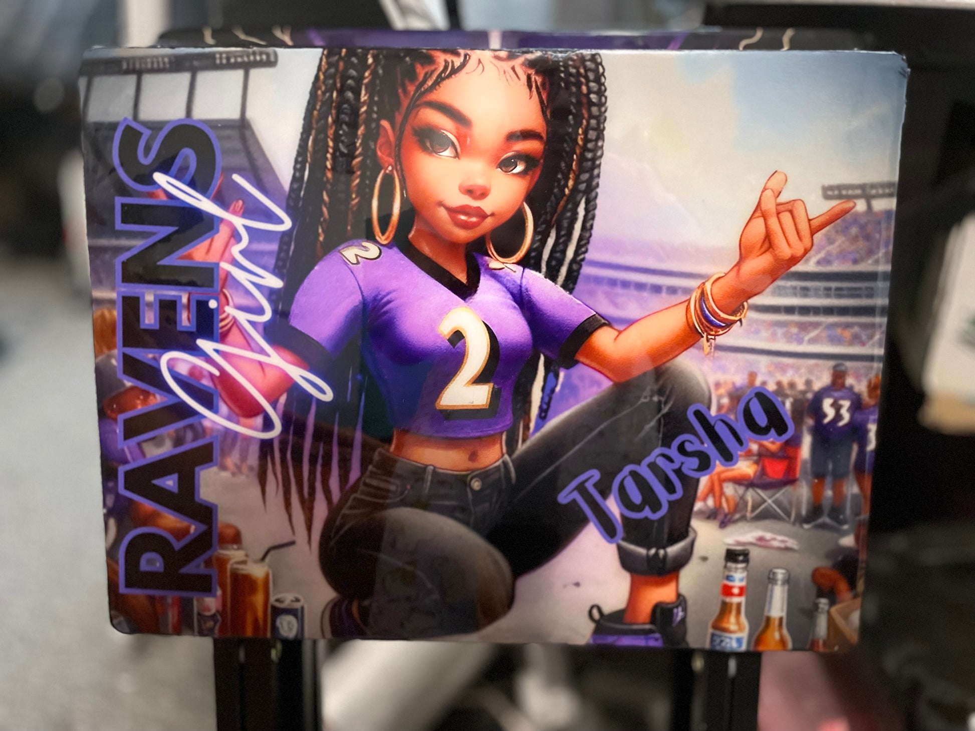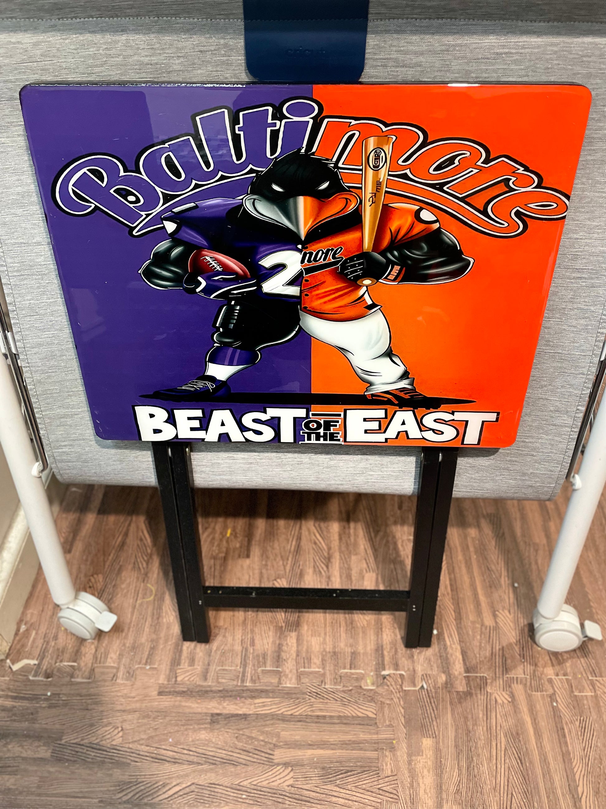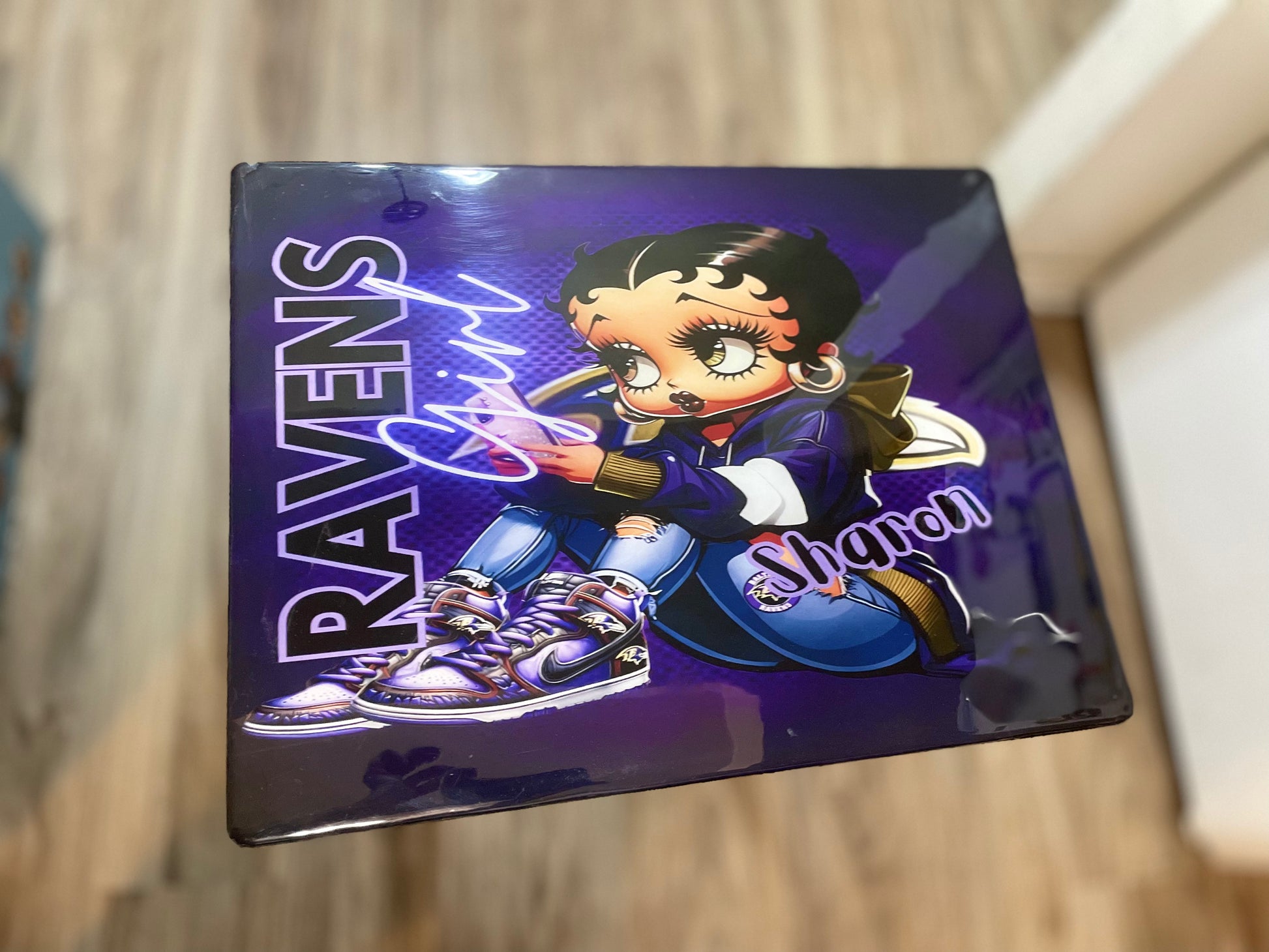 Looking for a bold and practical addition to your home? Look no further than our one-of-a-kind TV trays! These foldable trays are the ultimate solution for maximizing your personal space and can be utilized for work, dining, and multitasking. Simply upload your desired image and add a personal touch with a name to truly make it your own. Each tray, measuring 19 x 15 x 26, is protected with epoxy and will be processed within 5 business days. Keep in mind, all customized orders are final and non-refundable. Get yours now and take on new challenges with confidence!