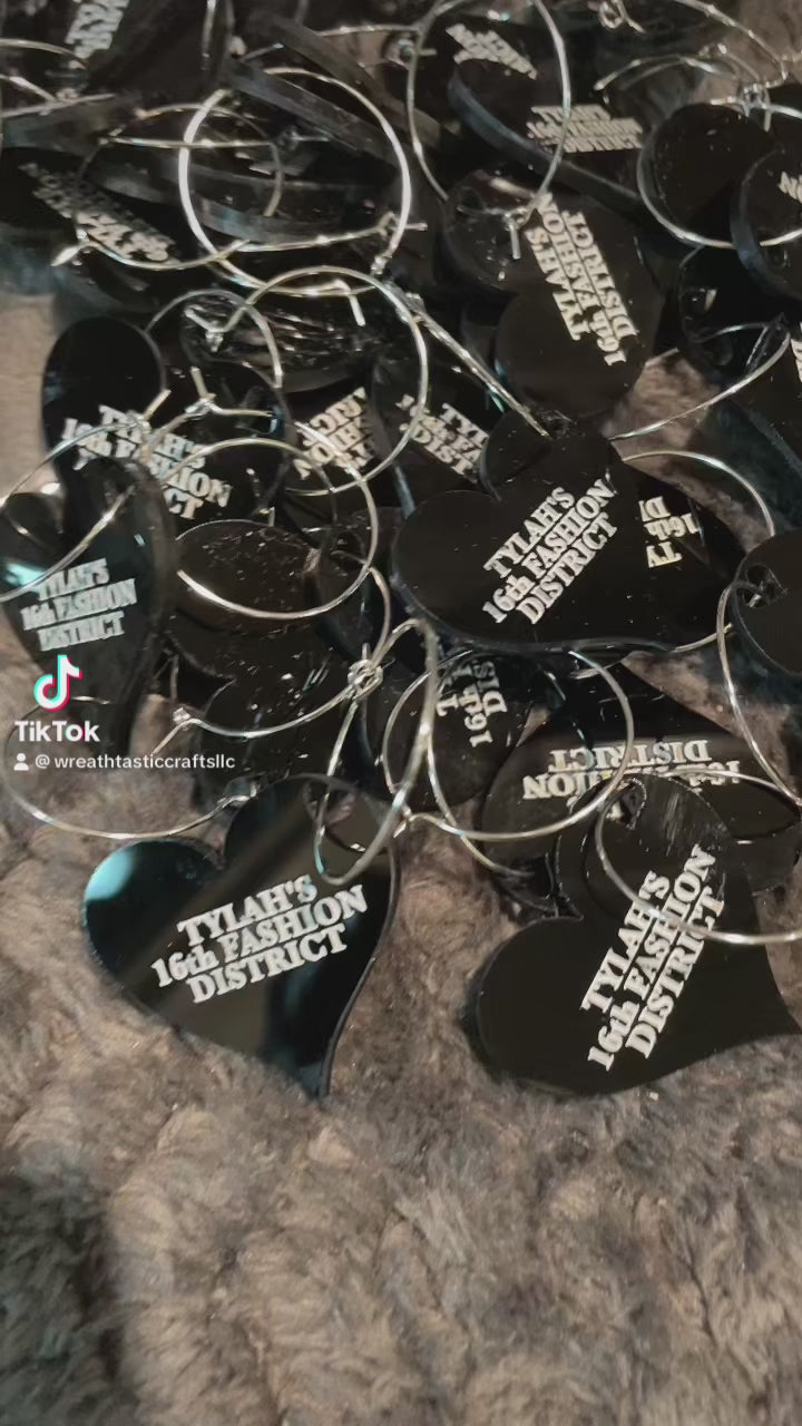 Custom Wine Glass Charms are the perfect addition to any wine lover's collection. Made from high-quality acrylic, these charms can be customized with a name, heart shape, or round design. Choose from silver mirror, gold mirror, pink, black, or wood accents to match any occasion. Enhance your wine experience with these unique and personalized charms. Custom orders are non refundable.